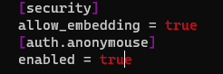 在 grafana 的配置文件中(如 default.ini,如果是 DF 中自带的 Grafana,需要编辑对应容器配置 yaml),设置对应的配置参数,在 security 一项中,打开允许嵌入,并开启允许匿名访问(可根据实际情况自行决定)