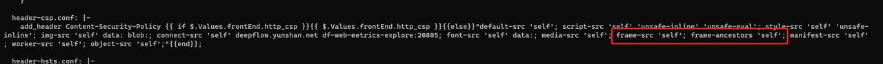 注意,如果是使用 DF 自带的 Grafana,需要在 front-end pod 的配置文件中删除如下内容,允许外部 iframe 访问。其他环境也注意检查是否有此限制。
